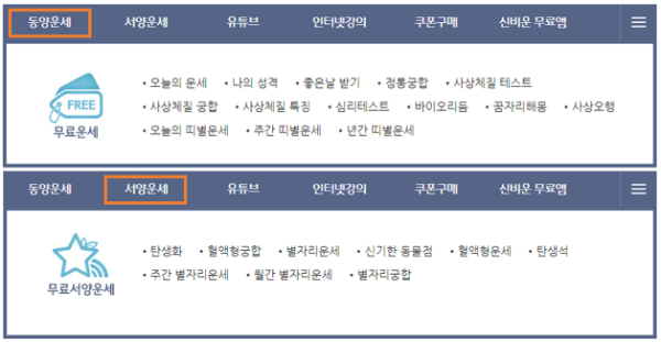 동양운세, 서양운세별로 유료 서비스도 있지만 정통궁합, 별자리 궁합, 혈액형 궁합은 무료로 제공하고 있습니다.