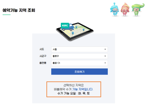 예약한 내역은 홈페이지에서 조회 및 취소가 가능하며, 예약 전에 내가 사는 지역이 무료 수거가 가능한지 `예약 가능 지역 조회` 메뉴를 통해서 가능 여부와 수거 가능 요일도 확인할 수 있습니다.